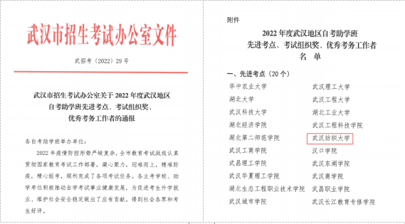 近日,武汉市招生考试办公室发布《关于2022年度武汉地区自考助学班先进考点、考试组织奖、优秀考务工作者的通报》(武招考〔2022〕29号),william威廉亚洲官方被评为自考先进考点,自考办主任张娟同志被评为优秀考务工作者。
