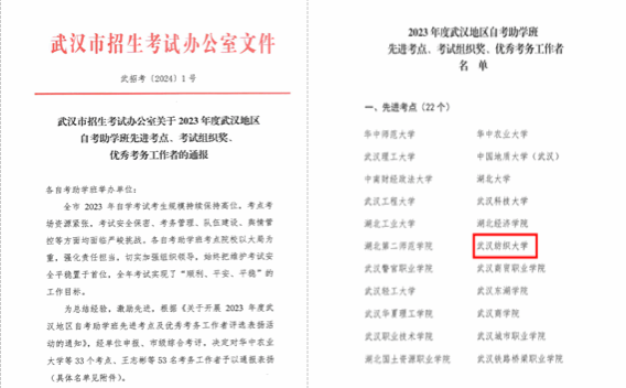 近日,武汉市招生考试办公室发布了《关于2023年度武汉地区自考助学班先进考点、考试组织奖、优秀考务工作者的通报》(武招考〔2024〕1号),william威廉亚洲官方被评为自考先进考点,继教学院张娟同志被评为优秀考务工作者。