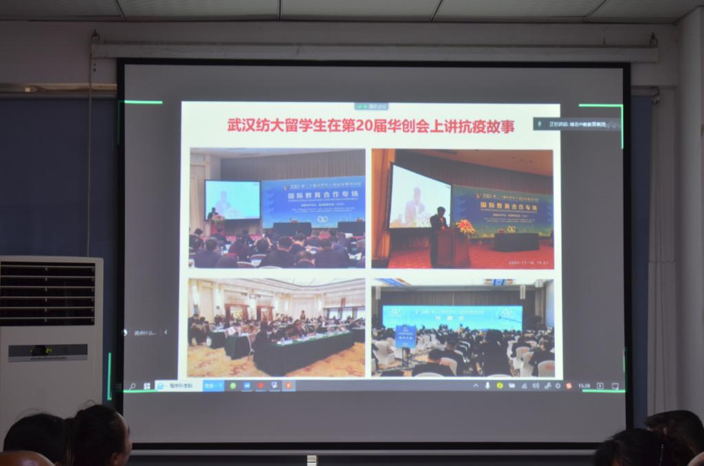 党课上展示了大量国际学生在国外一些主流媒体和自媒体上支持中国抗疫的舆论宣传成果。中间穿插视频连线,参与连线的是当年在武汉一起抗疫的国际学生。连线中,这些已经毕业的国际学生讲述了对中国抗疫的深刻印象,以及抗疫期间他们在国外媒体上给予中国的舆论支持。